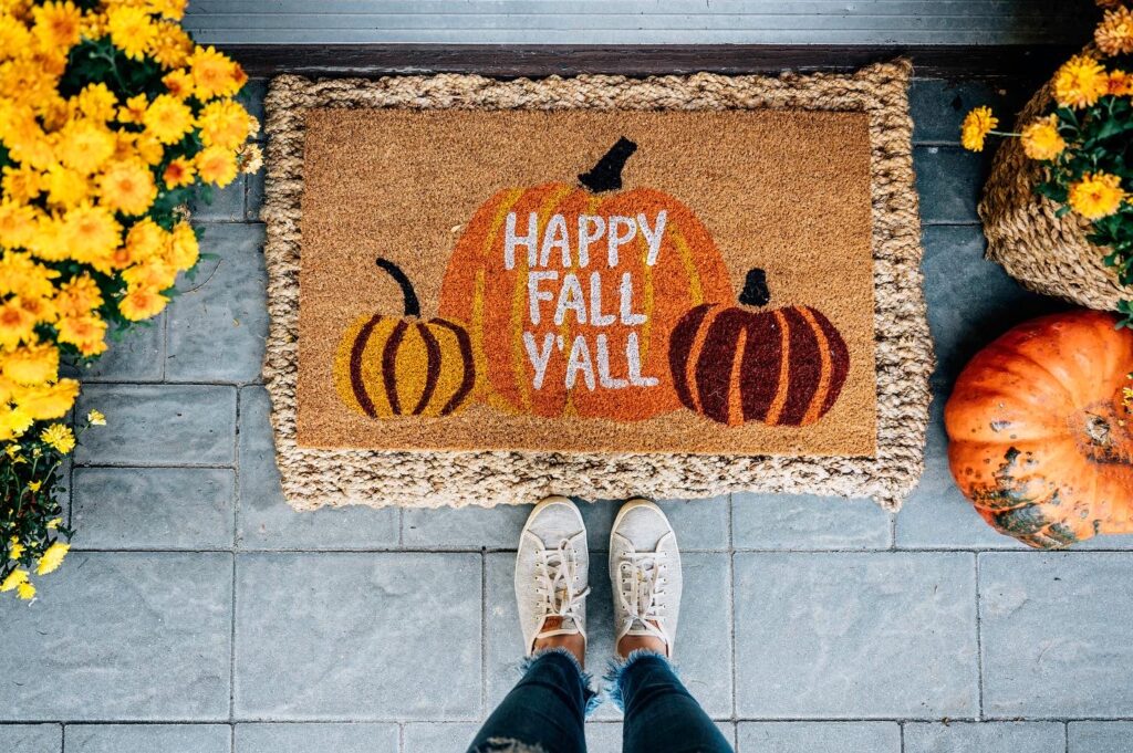 The front porch, the first impression. I love decorating front porches. October is a great time to do layered doormats, pumpkins, and mums to make it feel ready for fall.
