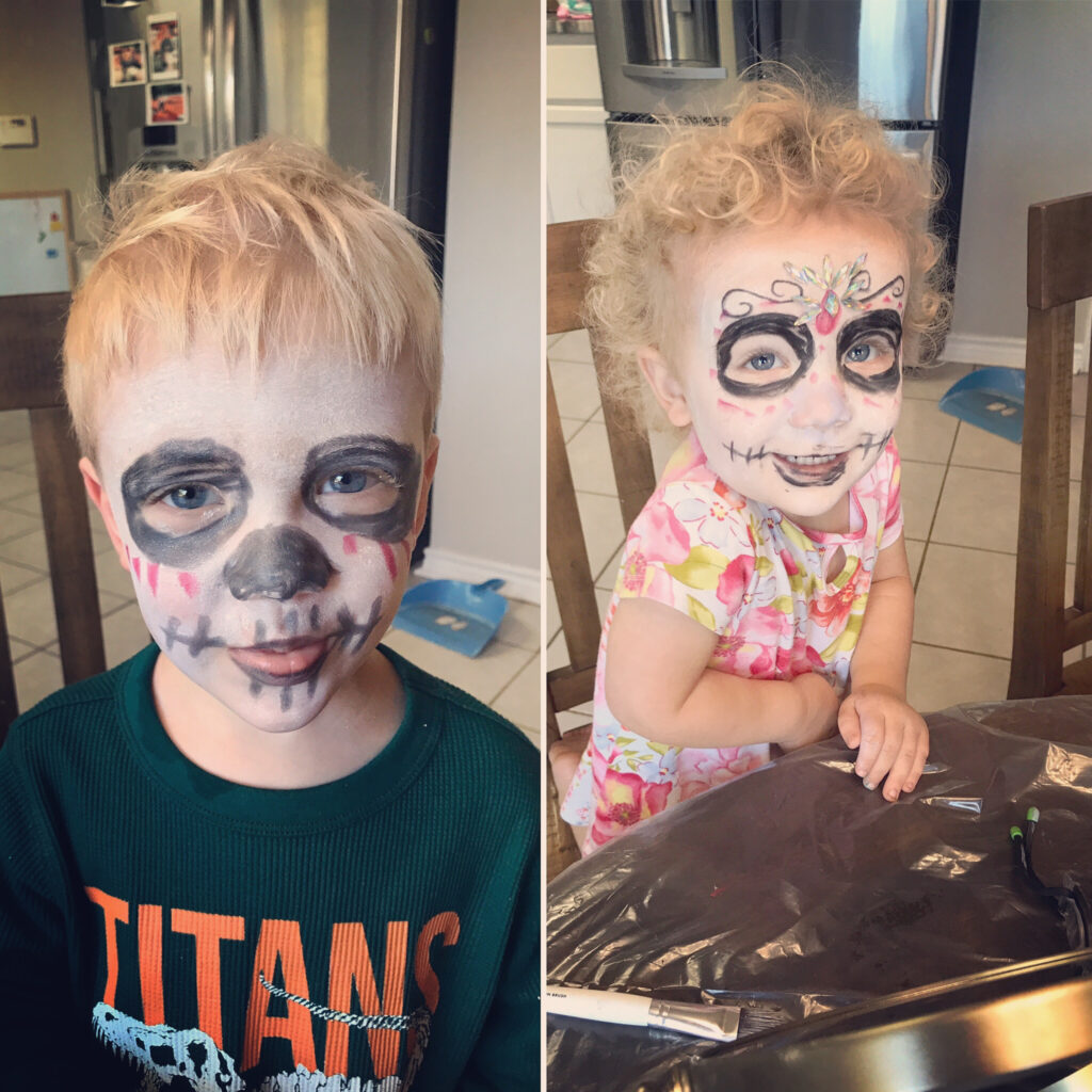 We keep it simple so everyone can join in, think paper pipercleaner pumpkins (use beads + pipe cleaners), plate ghosts, q-tip skeletons, handprint pumpkins, and leaf garlands. I usually set everything out on the kitchen table, turn on some/ music, and let the kids get messy. The crafts aren’t always “Pinterest perfect,” but they’re full of personality (and those are the ones I love most). If you want something that’s put together you can also find easy Halloween crafts at Target which is my go-to.