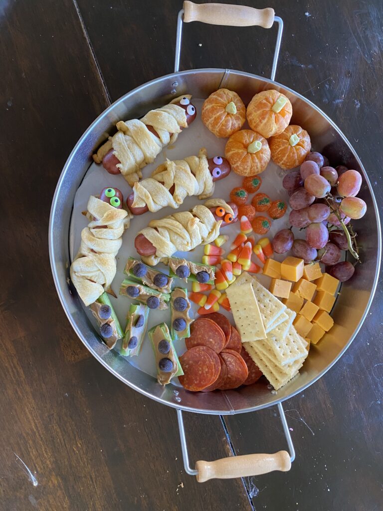 Some years we go all out with mummy dogs, jack-o’-lantern quesadillas, or spider-web pizza. Other year, I put together a Halloween snack tray for the kids. They love grazing while we watch a movie or do a craft, and it’s such an easy way to make an ordinary night feel special.