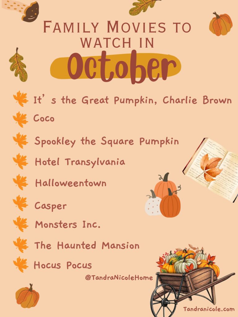 Friday nights are typically our family movie night and in October it’s all about the fall and Halloween scenes. We pile on the blankets, pull out our Nugget couches, make some popcorn and enjoy movies together. Some of our recent favorites have been Halloweentown, Casper, Hotel Transylvania and ParaNorman.